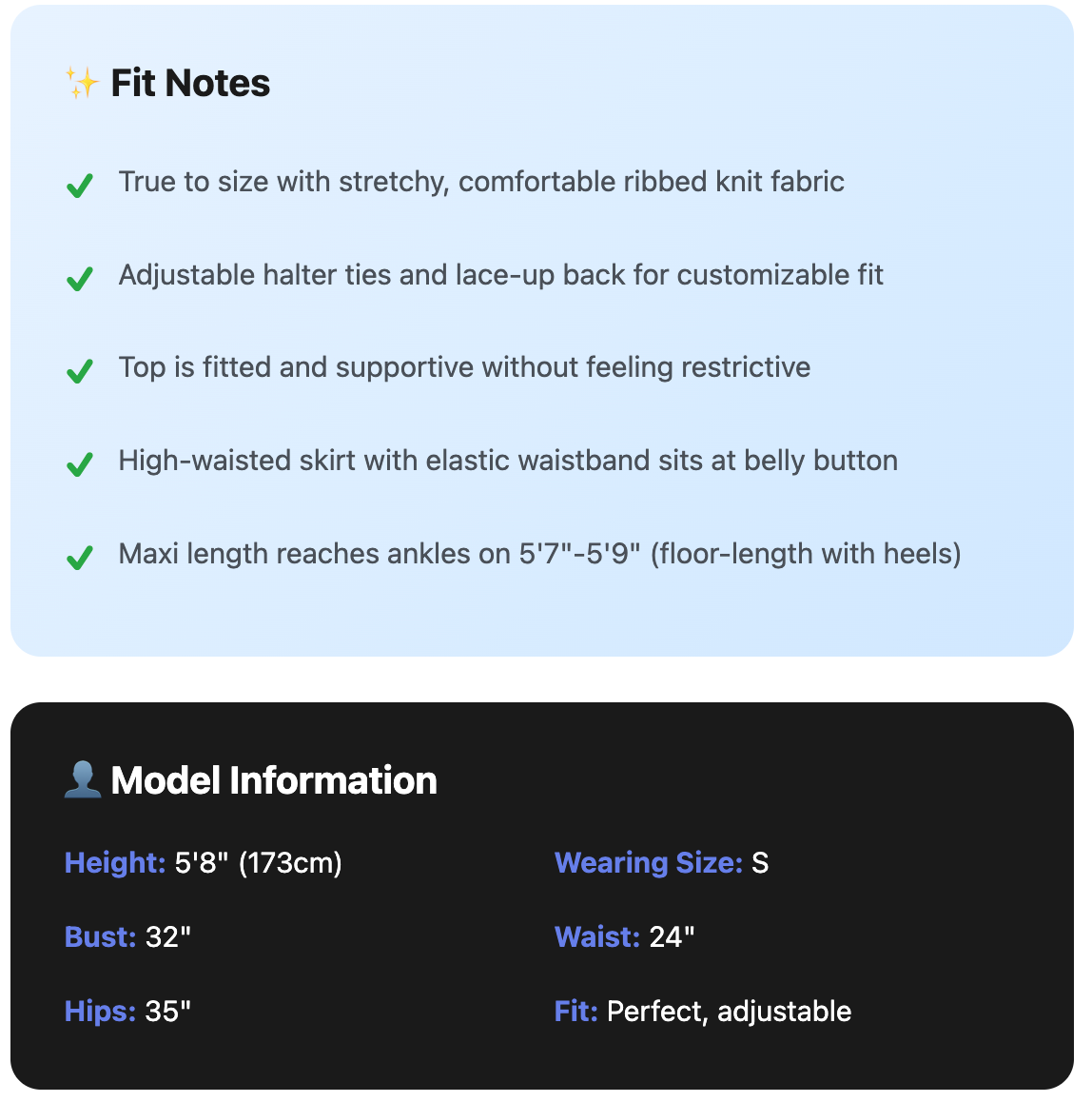 Length: Top hits at natural waist, skirt waistband sits at belly button, maxi length reaches ankles (floor-length with heels).