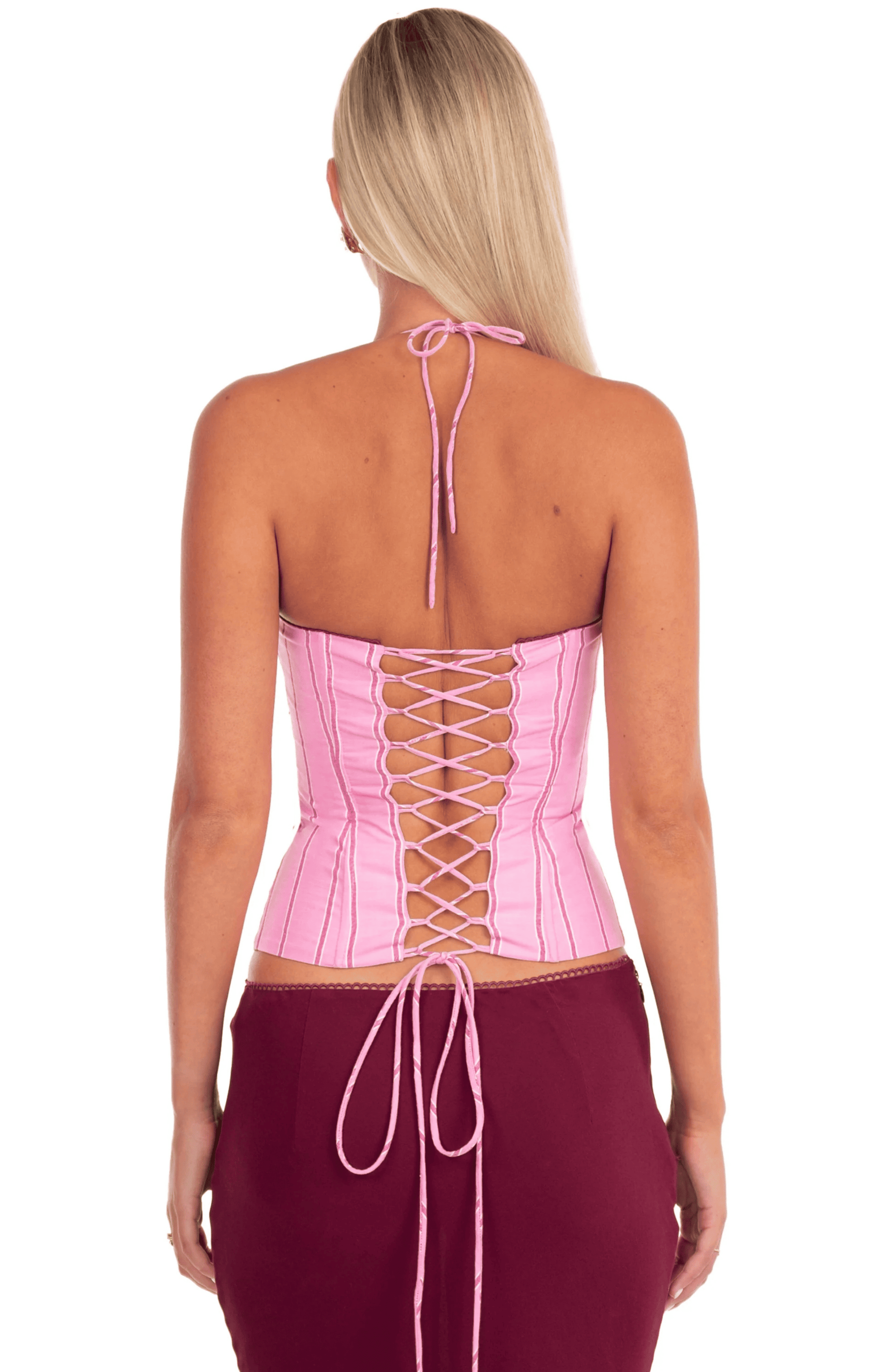 Fit: Fitted halter top with corset-style lacing at back, high-waisted drop-waist skirt with gathered maxi tier. Body-hugging through torso, flowy from hips down.