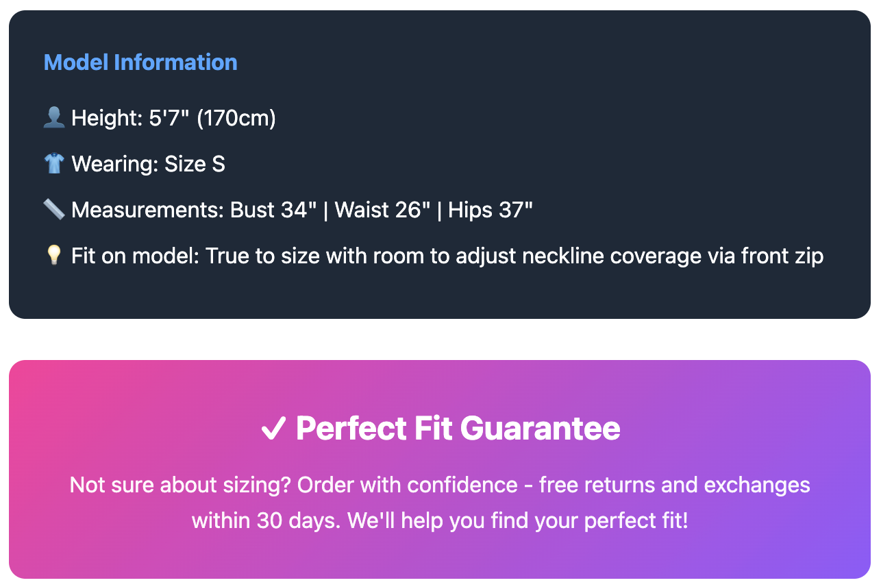 Model Info: Model is 5'7" (170cm) wearing size S. Bust 32", Waist 24", Hips 35".