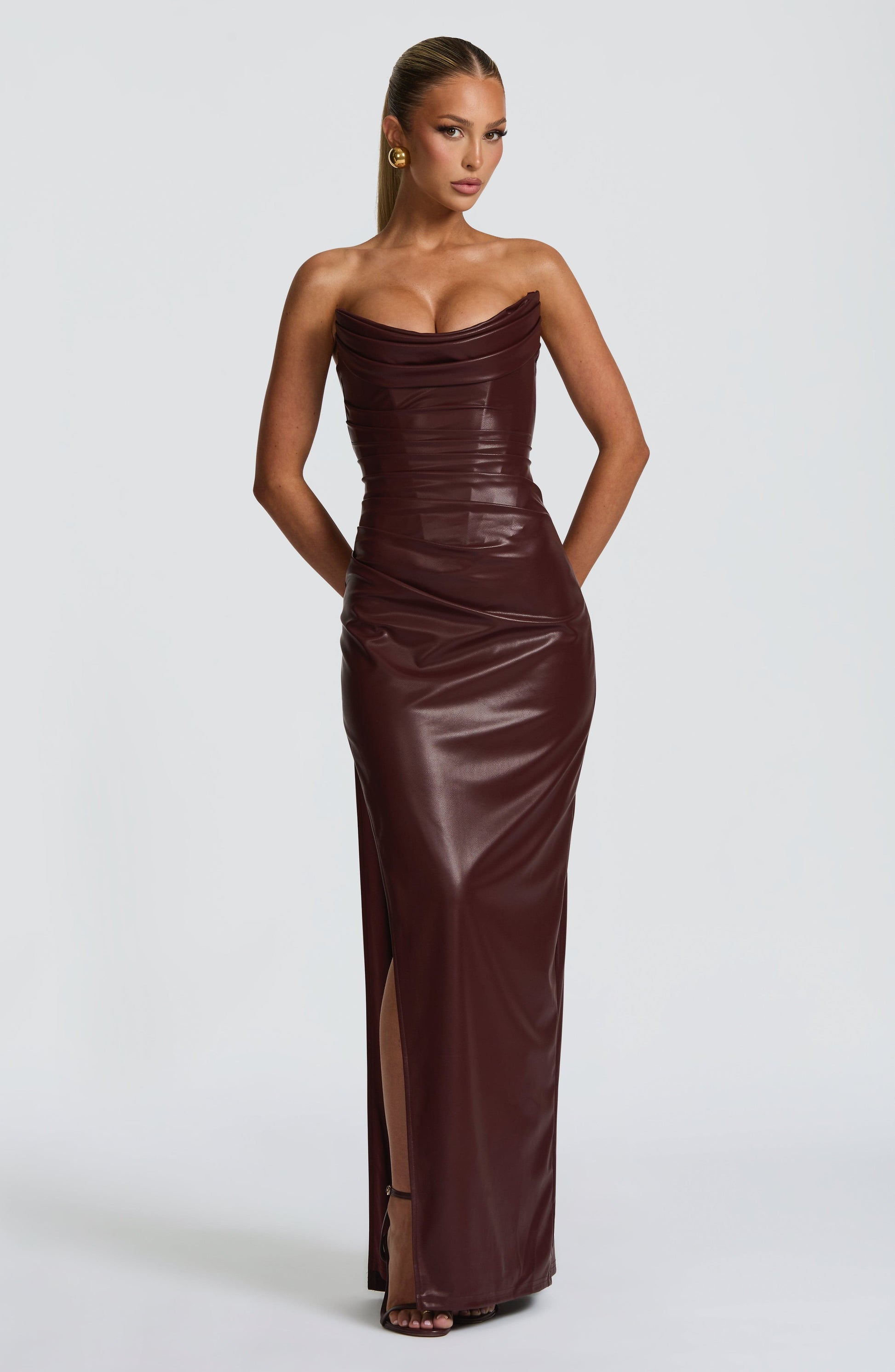 Fit: Bodycon silhouette with boned corset bodice and adjustable lace-up back. Strapless draped neckline with interior grip tape. Floor-length with dramatic thigh-high slit.