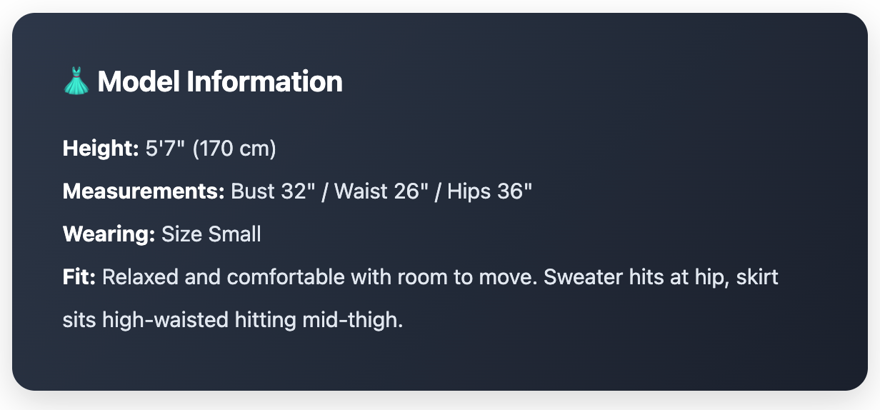 Length: Sweater: 24" from shoulder / Skirt: 16" from waist (hits mid-thigh)