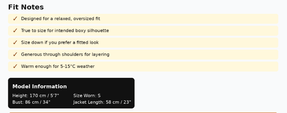Fit: Relaxed oversized fit with dropped shoulders. Boxy silhouette hits at hip. Designed for layering over chunky knits or thin tees.