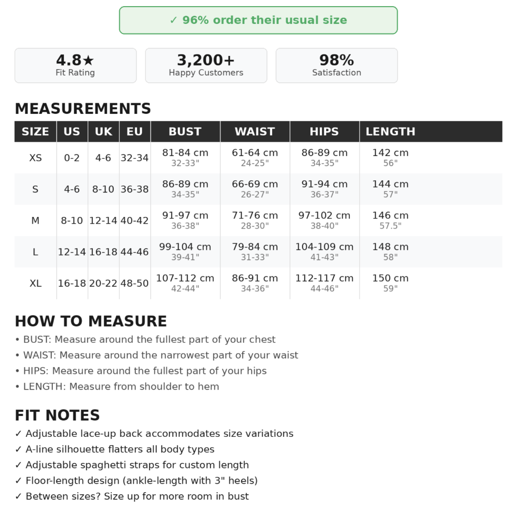 Fit: Fitted bodice with flowy A-line skirt. Adjustable lace-up back ensures custom fit through torso.