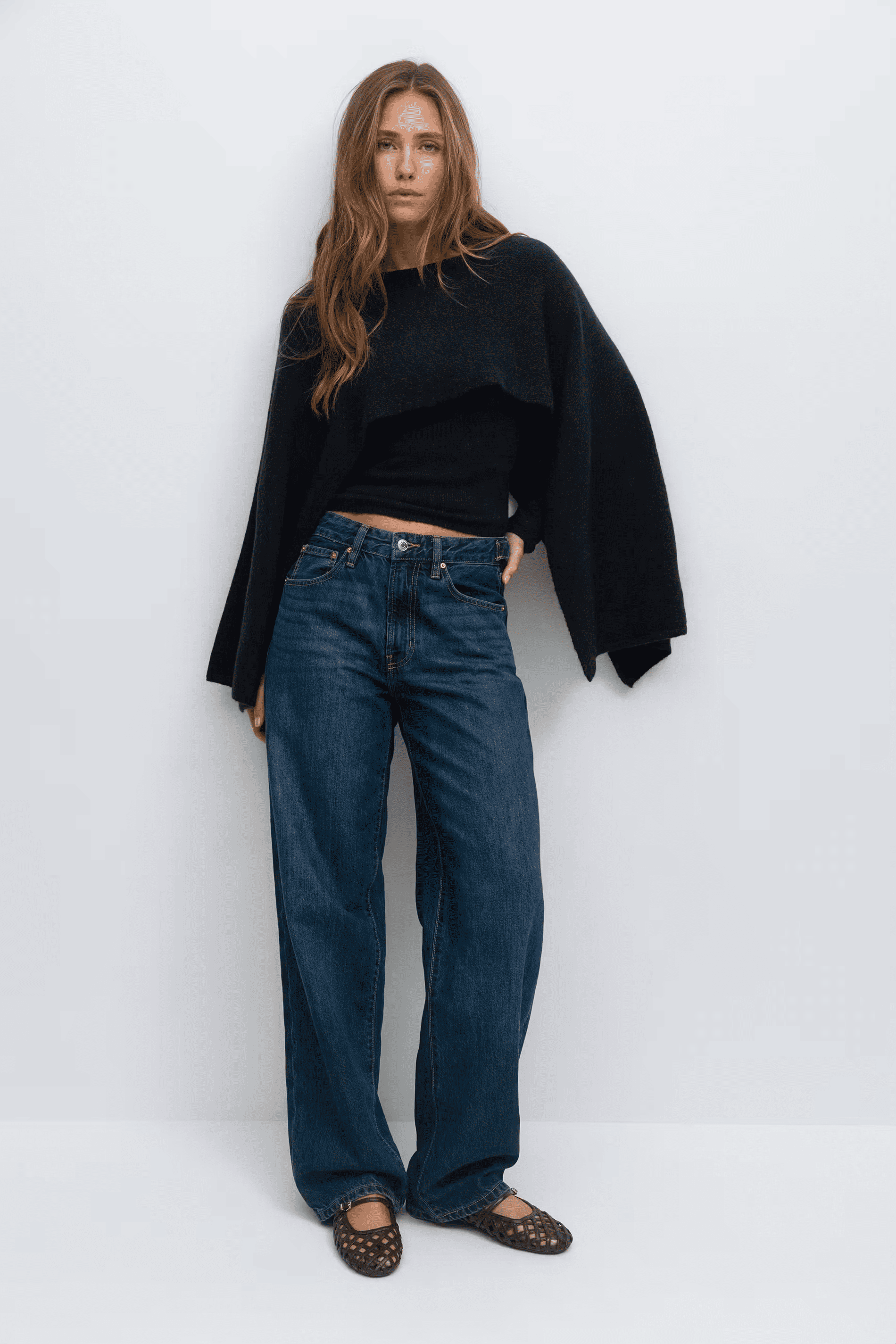 Length: Cropped length hits at natural waistline. Sleeves are extra wide and extend beyond hands for dramatic layered effect.
