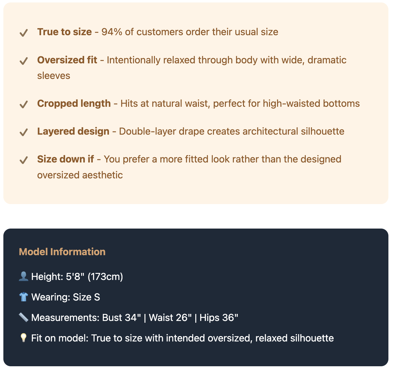 Fit: Oversized, relaxed silhouette with dramatic layered design. Wide sleeves create a cape-like drape effect while the cropped length hits at natural waist.